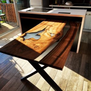 Fabrication et pose d'un îlot central et d'une table de salle à manger en noyer Français et résine Epoxy "Table rivière"