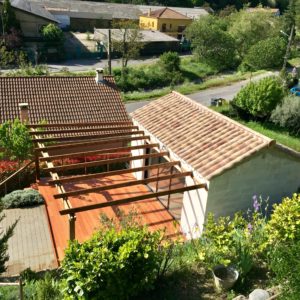Pour ce chantier afin d'agrandir la surface de la terrasse, nous avons supprimé l'ancien accès à la maisonnette en le couvrant totalement par la terrasse bois. Nous avons reculé l'escalier, posé un garde corps le plus léger possible à l'oeil (pas d'enfant en vue...) et créé une pergola qui recevra soit des canisses soit des voiles d'ombrage. (photos avant-après)